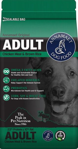 Receptura Annamaet Original ADULT s nejnižším obsahem energie z řady Original je ideálním krmivem pro méně aktivní psy, starší psy a psy velkých plemen – obecně pro psy s pomalejším metabolismem.