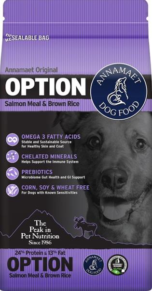 Receptura Annamaet Original OPTION, vyrobená z divokých tichomořských lososů a jehněčího, představuje alternativu k drůbežím recepturám Annamaet, ideální např. pro psy trpící potravinovými alergiemi a intolerancemi.