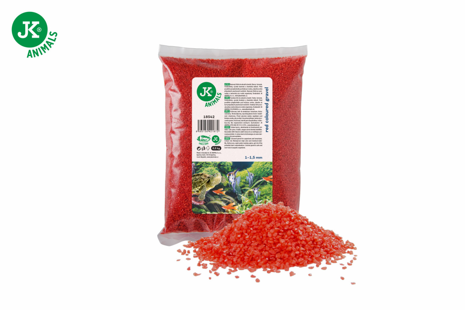Barevný dekorační štěrk do akvárií a terárií. Balení 0,5 kg. Frakce 1–1,5 mm. Barva: červená. Voděodolný, vysoká barevná a chemická stálost.