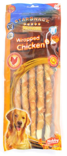 Žvýkací tyčky pro psy – sušená hovězí kůže obalená kuřetem.