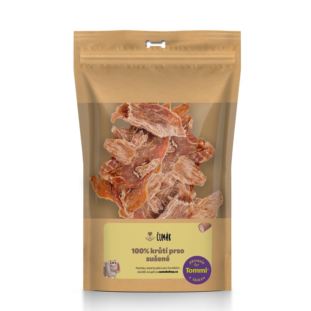 Ne náhodou je krůtí prsíčko náš pilotní pamlsek. Sušené krůtí prsíčko (usušeno ze 400g syrového masa) v sobě má spoustu bílkovin, nízký obsah tuku, je hypoalergenní, a hlavně strašně dobrý. Kromě šťastného čumáku tak pomůže vašemu mazlíčkovi i k nádherné srsti a zdravým svalům. Je jen na vás, jestli ho odměníte malým kouskem, anebo svoje spektrum lásky vyjádříte pořádnou porcí. Musíme vás ale varovat, hrozí totiž, že po prvním balíčku už jiné pamlsky nebudou vašemu čumákovi po chuti. Složení: Krůtí prso 100 % (sušené v potravinářské kvalitě) Energetickáhodnota: 1380 kJ (330 kcal) Výživovéhodnoty: Bílkoviny 82,9 %, tuky 4,78 %, cukry 0,47 %, vláknina 0,17 %