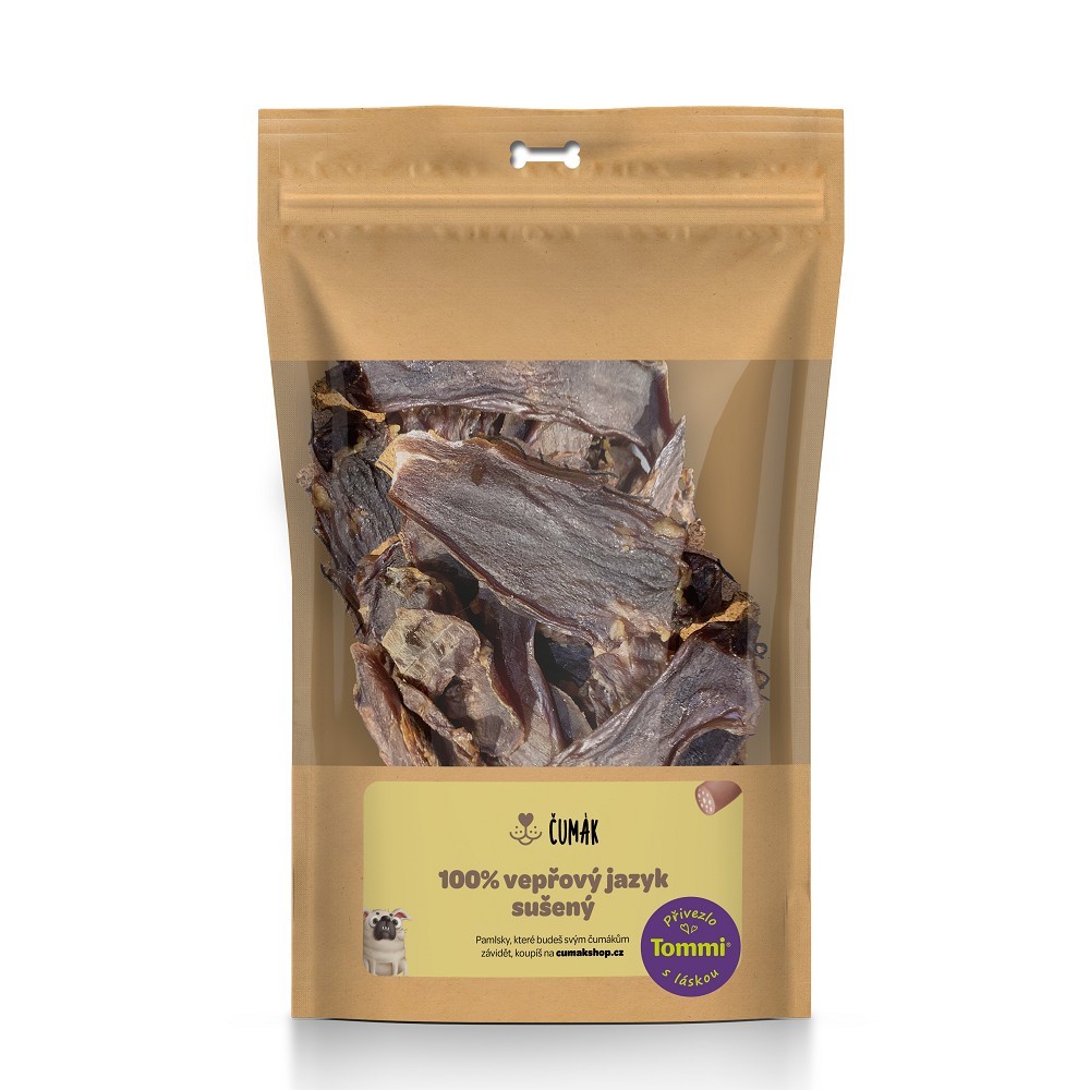 Sušený vepřový jazyk (usušeno ze 400g suroviny) má velmi bohaté vitaminové složení. Například vitamin cholin, který umožňuje správné fungování jater, nervů a metabolismu. Dále obsahuje některé zástupce skupiny B, tokoferol, thiamin a niacin. Z minerálů se zde vyskytují K, Ca, Mg, Na, S, Fe, Co, Mn. Jazyk lze právem považovat za delikatesu, která potěší vašeho čtyřnohého čumáka - je lahodný a výživný.