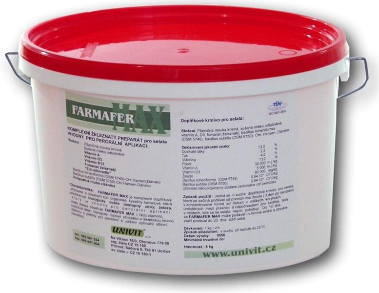 Jedná se o suché doplňkové krmivo pro selata, které se začíná podávat od prvních dnů života (3. den po narození ) v koncentrované formě ad libitum v mělkých korýtkách, umístěných mezi prasnicí a odpočívadlem pro selátka, tedy v místech, kde se selata nejvíc pohybují. Od 10. dne se FARMAFER MAX může podávat i v krmné směsi a obvykle stačí podávat do 20. dne stáří selat.