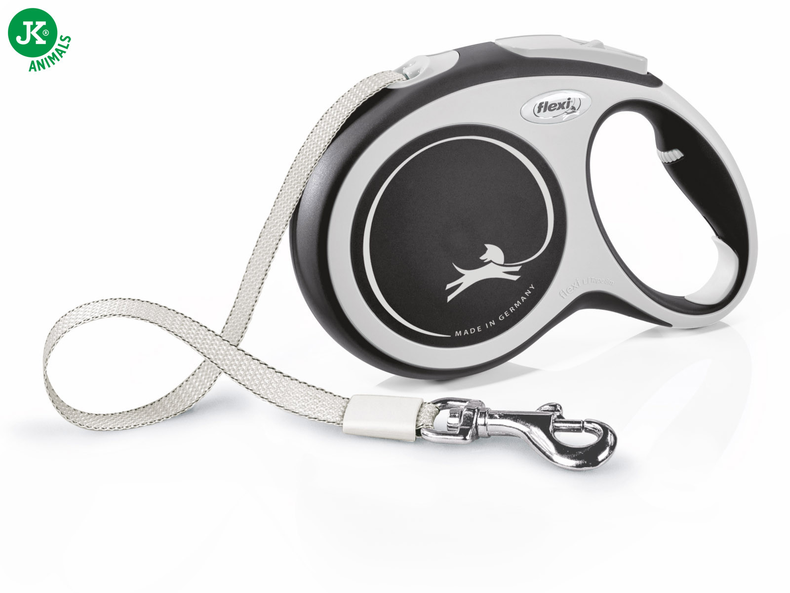 Flexi New Comfort L, velké, páskové vodítko, černé. Vodítko flexi New Comfort v páskovém provedení a velikosti L je určeno především pro velké psy do hmotnosti 50 kg. Vodítko má na konci chromovanou kovovou karabinu, která je velmi pevná a odolná. Vodítko má krásné barvy. Samonavíjecí vodítko je vybaveno brzdou s krátkým zdvihem pro rychlé zastavení s tlačítkem pro blokování/fixaci na stanovené délce. Vodítko má pevné a ergonomicky tvarované držadlo. Vodítko je možno doplnit příslušenstvím jako je Multi-Box a LED svítilna.