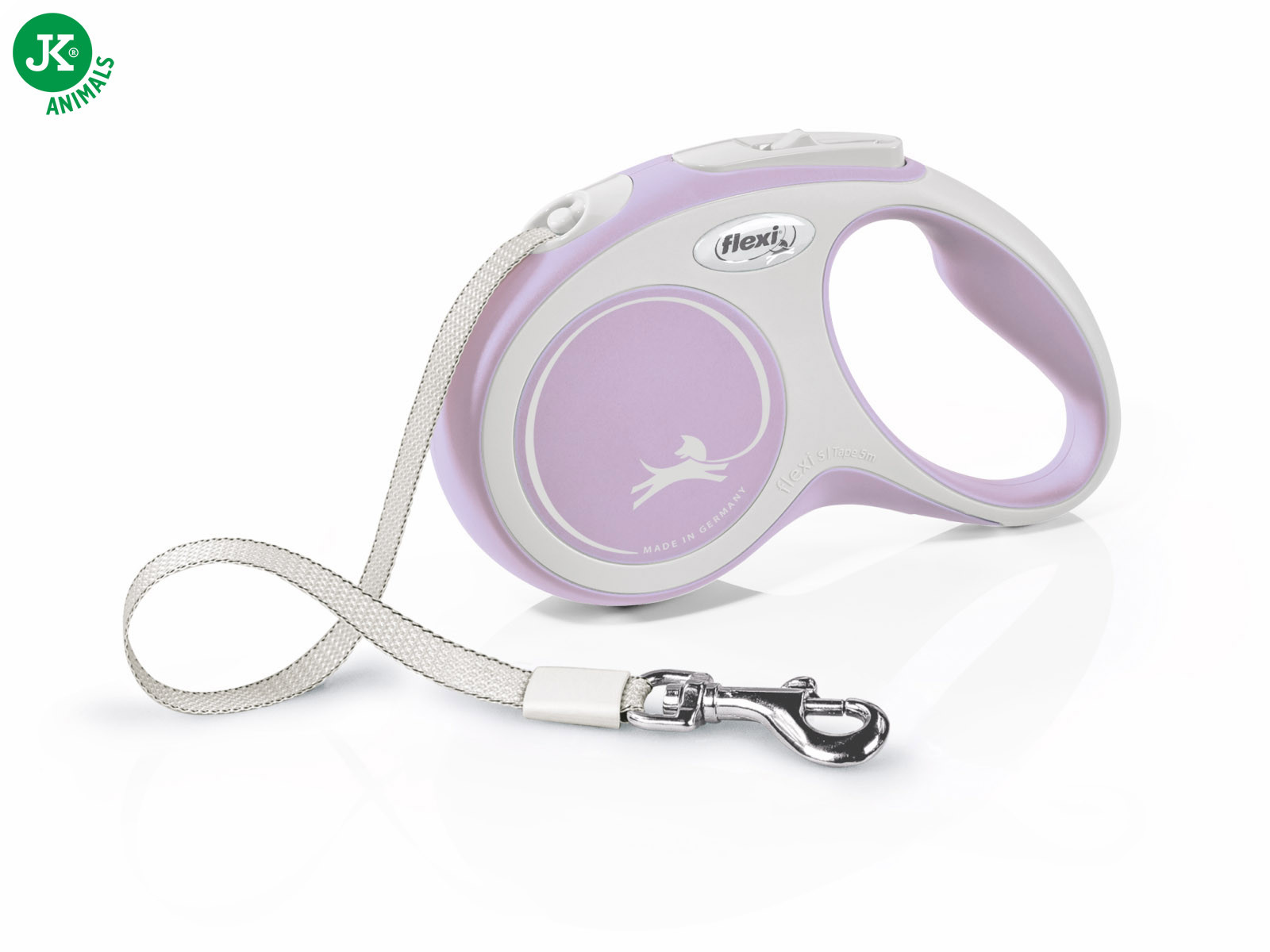 Flexi New Comfort S, malé, páskové vodítko, fialové. Vodítko flexi New Comfort v páskovém provedení a velikosti S je určeno především pro malé psy do hmotnosti 15 kg. Vodítko má na konci chromovanou kovovou karabinu, která je velmi pevná a odolná. Vodítko má krásné barvy. Samonavíjecí vodítko je vybaveno brzdou s krátkým zdvihem pro rychlé zastavení s tlačítkem pro blokování/fixaci na stanovené délce. Vodítko je lehké, má pevné a ergonomicky tvarované držadlo. Vodítko je možno doplnit příslušenstvím jako je Multi-Box a LED svítilna.