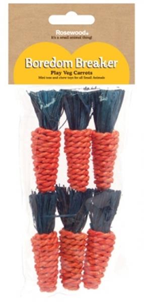 Šest mrkviček vyrobený z přírodních materiálů, které zabaví králíky, morčata, osmáky, křečky a další hlodavce. Podnítí aktivitu zvířat, hlodání, zažene nudu a tím přispívá k jejich psychické pohodě. Mrkvičky spletené ze sisalu a natí z kukuřičného šustí, obarvené pro zvířata bezpečnými barvami.