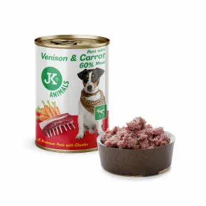JK Premium Venison & Carrot, Paté with Chunks, 60 % Meat. Zvěřina s mrkví, prémiová konzerva, paštika s kousky. Kompletní krmivo pro dospělé psy všech plemen.