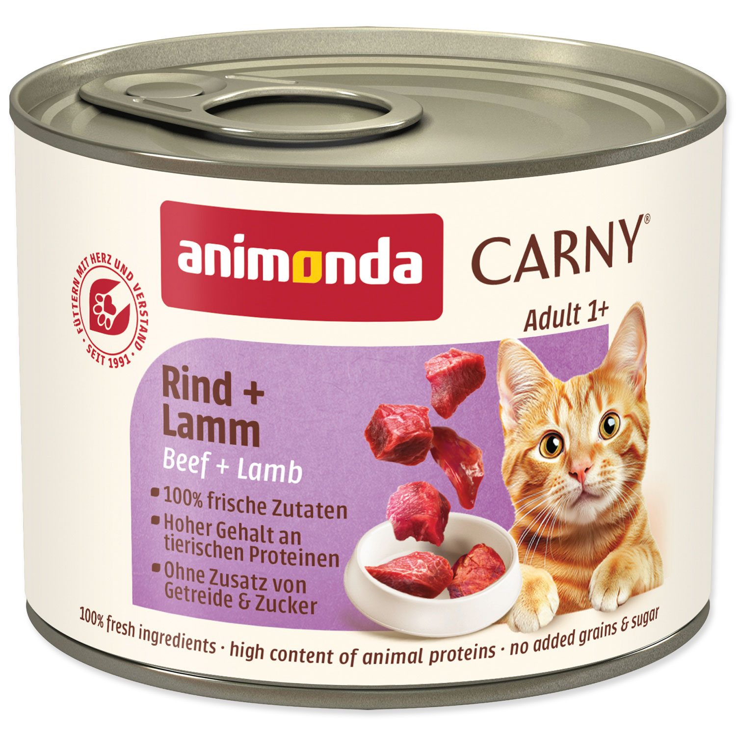 Konzerva s hovězím a jehněčím masem, kompletní krmivo pro dospělé kočky.