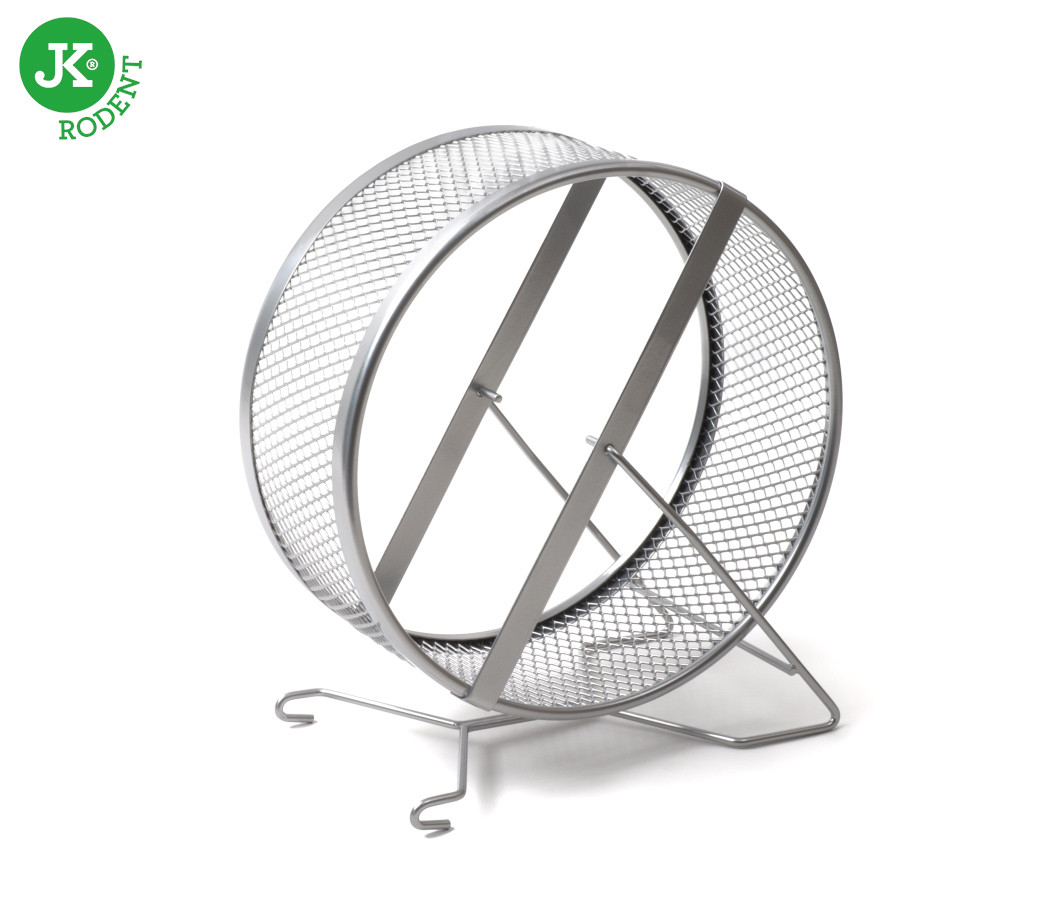 Kovový kolotoč pro hlodavce chromového vzhledu, jehož obvod je tvořen sítem, zažene Vašemu