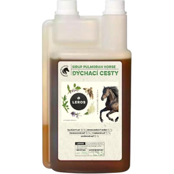 Bylinný Sirup Pulmoran Horse Dýchací cesty podporuje normální funkce dýchacího ústrojí koní. Byliny obsažené v sirupu napomáhají rozpouštění hlenů a odkašlávání. Použití sirupu je vhodné i jako preventivní ochrana. Vhodný pro koně trpící astmatem. Zmírňuje alergické reakce na prach a seno.
