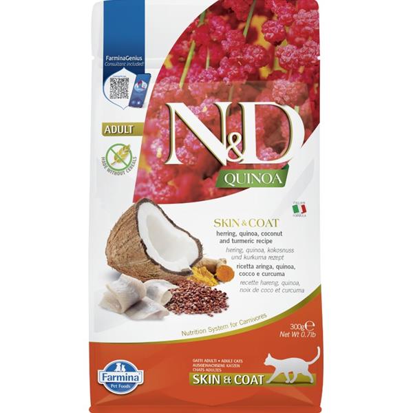 Vyvážené funkční krmivo je určené pro dospělé kočky při nežádoucí reakci na potravu pro navrácení a udržení zdraví kůže a srsti. Hlavním zdrojem vysoce kvalitních bílkovin v krmivu je hypoalergenní sleď. Přidaná quinoa v bio kvalitě pěstovaná v Itálii podporuje trávení, absorpci živin a celkově zdraví trávicího traktu. Dále je bohatá na vzácné aminokyseliny a přírodní antioxidanty a má nízký glykemický index. Rybí olej zaručuje optimální poměr omega-3 a omega-6 mastných kyselin pro dobrou kondici kůže a srsti a jejich regenerační schopnost. Přídavek glukosaminu a chondroitinu vyživuje kloubní chrupavky, stimuluje růst a ochraňuje klouby. Krmivo neobsahuje obiloviny, geneticky modifikované suroviny, umělá barviva, bílkoviny ze sóji ani hormonální nebo antibiotická rezidua.