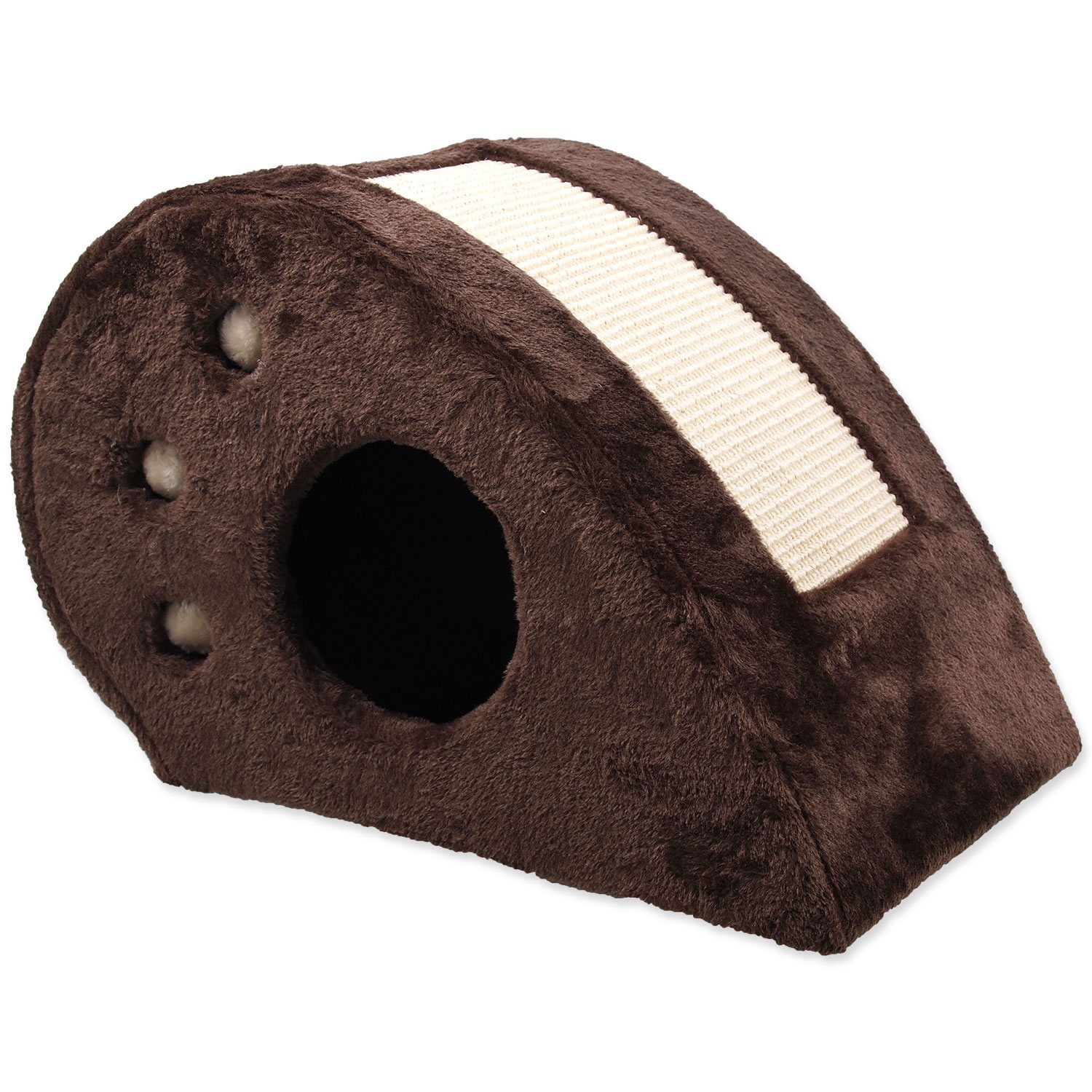 Odpočívadlo s plyšovým potahem. Atraktivní je pro kočky také díky otvoru, ve kterém se kočka může schovat a odpočívat v něm.