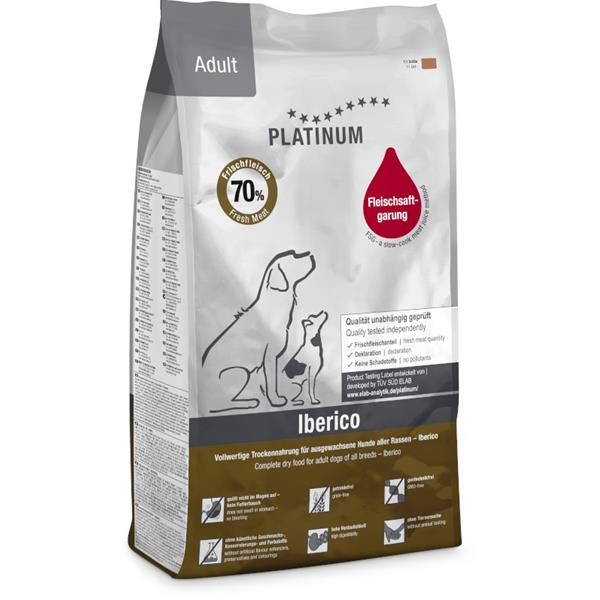 Polovlhké krmivo Platinum Adult Iberico je založené na iberském vepřovém mase, které patří mezi nejkvalitnější masa na světě. Má výraznou chuť, je šťavnaté, výživné a psi jeho chuť zbožňují. Iberská prasata jsou kříženci domácího a divokého prasete, proto se v jejich mase snoubí chuť zvěřiny s vepřovým. Pečlivě vyladěné složení navíc neobsahuje žádné obiloviny (grain-free), je přirozeně bezlepkové a hypoalergenní. Pochutnají si na něm psi s alergiemi na jiné druhy masa, psi v aktivní zátěži i vitální senioři. Receptura obsahuje také sušené rybí maso a lososový olej a má díky tomu vyvážený poměr omega-3 a omega-6 mastných kyselin. Díky jedinečné přípravě metodou Fleischsaftgarung (vaření ve vlastní šťávě ve vakuu za nízkých teplot) si navíc granule zachovávají důležité živiny, bohatou chuť i vůni. Granule jsou balené do alu-foliových pytlů, které zachovají čerstvost a vůni do posledního sousta.