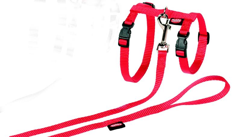 Červený postroj pro kočky s vodítkem z nylonu ve velikosti XL.
