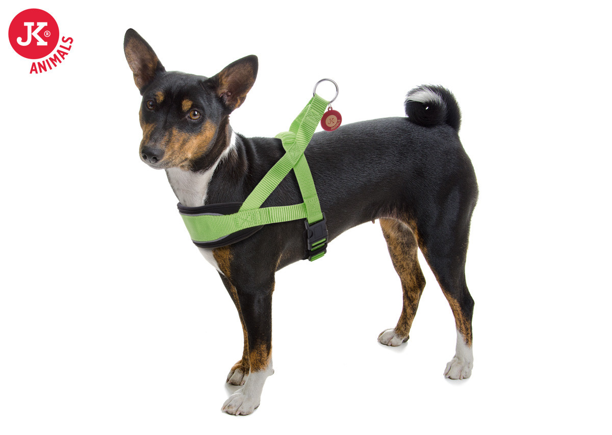 Stylový nylonový postroj pro psy je opatřen měkkými výztuhami, aby netlačil psa na hrudi, bezpečnostními reflexními prvky a gumou na hřbetě, která zajišťuje lepší komfort při nošení.