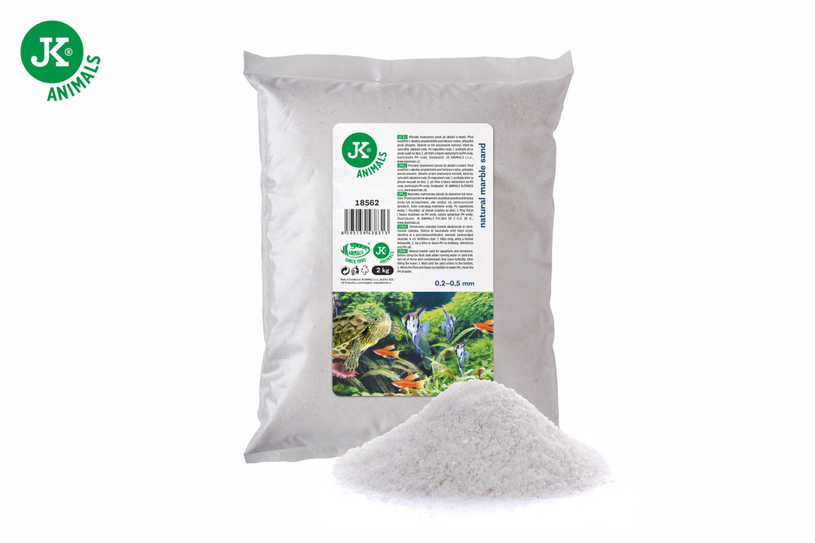 Přírodní mramorový písek do akvárií a terárií. Balení 2 kg. Frakce 0,2–0,5 mm.