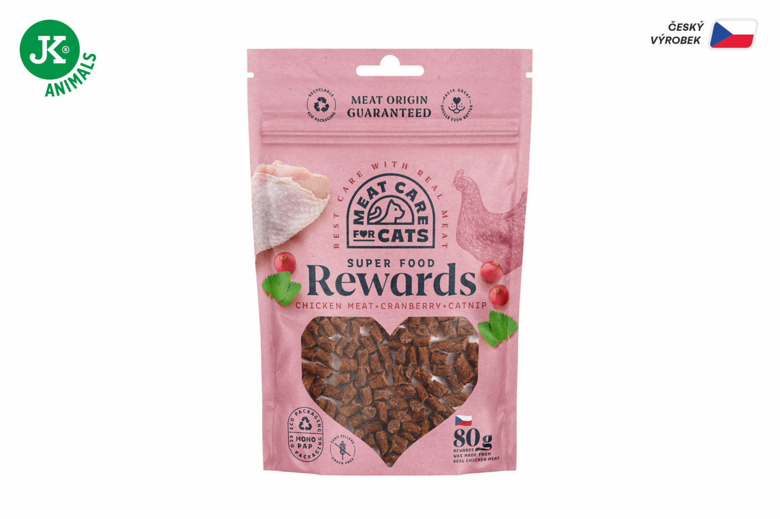 Bez obilovin, bez přidaného cukru, bez umělých barviv, min. 80 % čerstvých surovin. Kuřecí maso: je vhodné pro kočky především svým nižším obsahem tuku a dobrou stravitelností. Šanta kočičí (catnip): má uklidňující účinky. Podporuje trávení. Kočky tato bylina přirozeně láká. Brusinka: napomáhá správnému fungování močových cest. Má antibakteriální a antimikrobiální účinky.