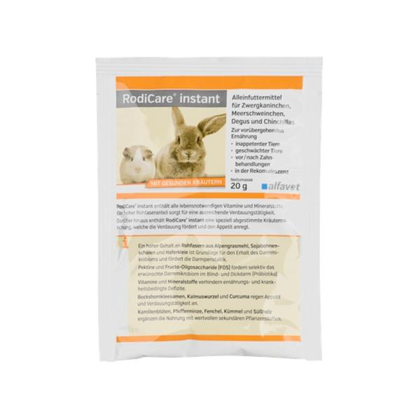 RodiCare Instant je hodnotné kompletní krmivo v práškové formě – tzv. „tekuté seno“ – určené pro zakrslé králíky, morčata, osmáky a činčily, kteří přechodně nemohou přijímat pevnou stravu. Je také vhodné k dočasné výživě zvířat s nechutenstvím, oslabených zvířat, před a po ošetření zubů a v rekonvalescenci, pro odchov osiřelých mláďat i jako doplněk krmiva u slabých a churavějících zvířat.