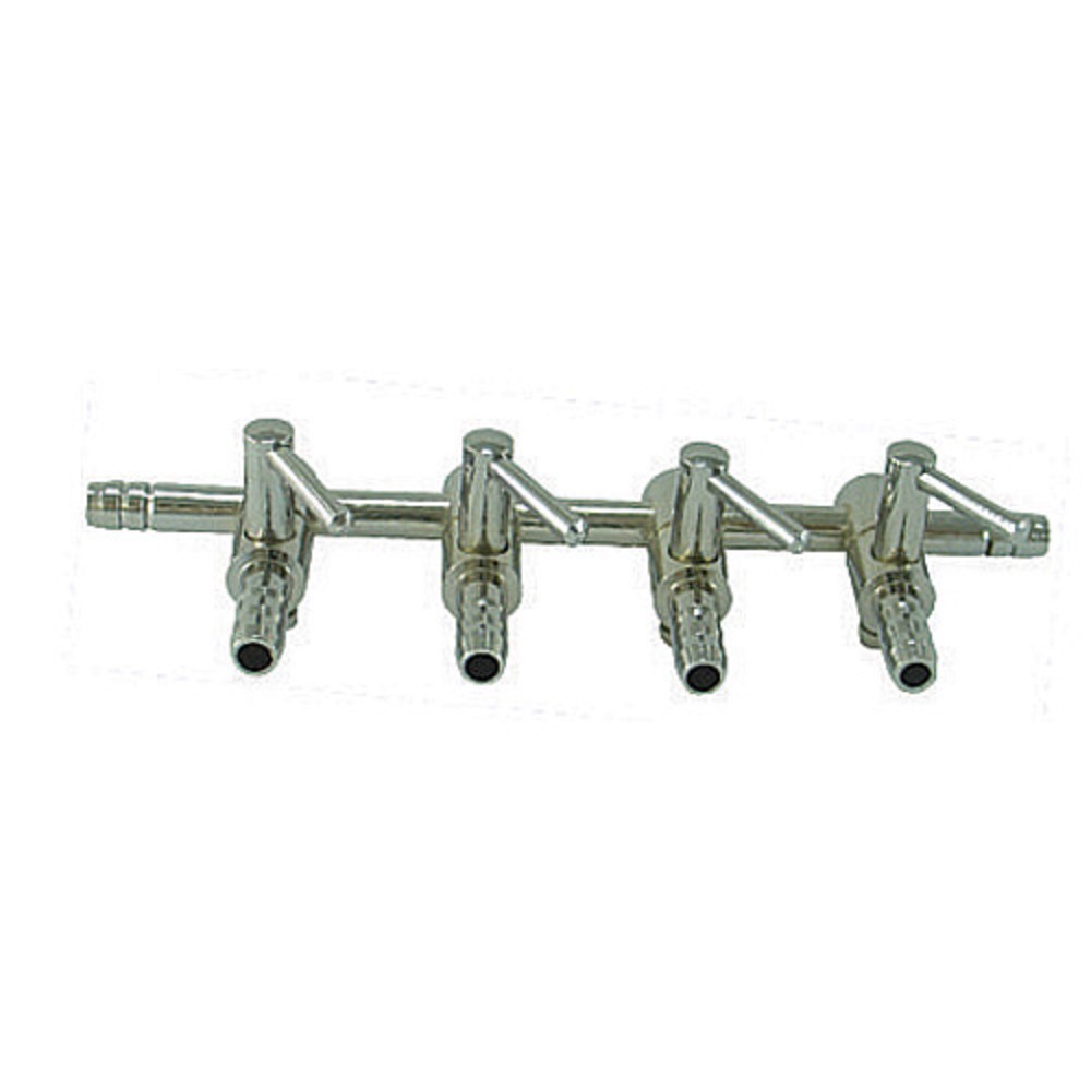 Nerezová rozvodnice pro větvení rozvodů vzduchu v provedení s neobyčejně jemnou regulací množství procházejícího vzduchu prostřednictvím vestavěných kohoutů.