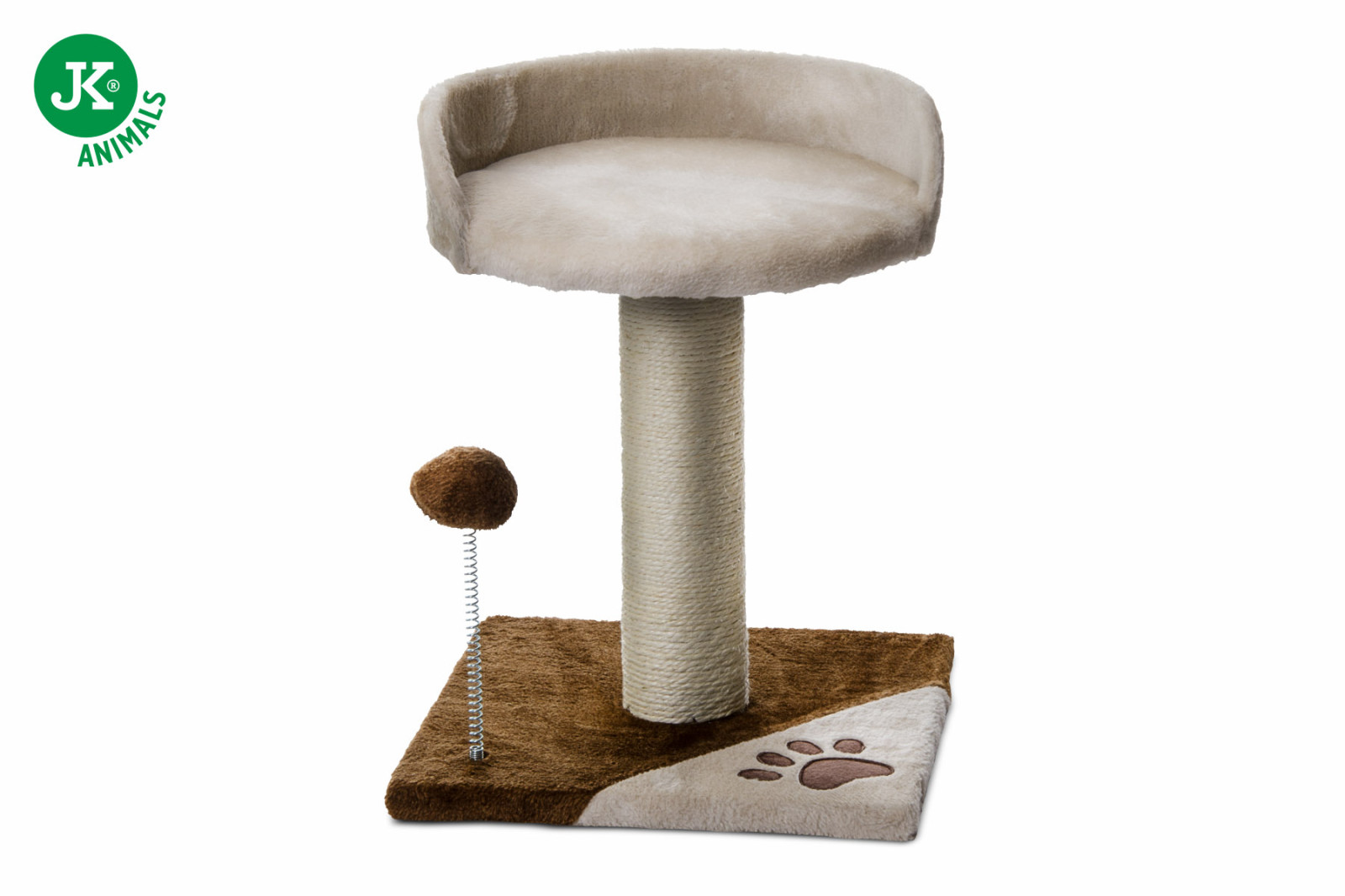 Praktické škrabadlo pro kočky žijící v bytě. Toto malé škrabadlo se hodí i do malých bytů, kde nezabere mnoho místa. Škrabadlo má vyvýšenou odpočinkovou plochou na ležení a hračku v podobě plyšové bambule na pružině, se kterou si kočky skvěle vyhrají. Sloup je potažený odolným přírodním sisalem vhodným pro péči a udržování drápků.