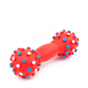 Vinylová pískací hračka, Činka s bodlinami. Hračka ve tvaru činky s výraznými bodlinami natřenými barevnými kolečky je ideální hračkou pro aktivní hru s pejskem. Hračka je plovoucí na hladině. Hračka je pískací. Díky pískátku snadno upoutáte pozornost vašeho pejska a ten bude připraven na zábavnou hru. Hračka je vhodná pro použití venku i doma.
