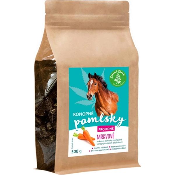 Mrkvové pamlsky obohacené bylinkami a konopným olejem jsou zdravou odměnou vhodnou pro koně všech plemen a věkových kategorií. Receptura je čistě přírodní, bez obilnin (grain-free) a konzervantů. Pamlsky jsou lisované zastudena, takže nedochází ke znehodnocení prospěšných látek v bylinkách a konopí. Semínka slunečnice patří mezi nejbohatší zdroj vitamínu E. Bylinky v pamlscích mají protizánětlivé účinky a podporují chutnost. Konopný olej působí příznivě na kvalitu srsti a kopyt.